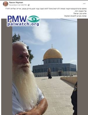 The mention of a call to destroy the Dome of the Rock refers to Temple Mount Heritage Foundation Chairman Yaacov Hayman’s apparently lighthearted post on Facebook on Nov. 4, 2021, which included a picture showing Hayman standing in front of the Dome of the Rock. In it, Hayman wrote: “Looking for an engineer/constructor demolitions expert who can give an estimate for planning a controlled dismantling, wrapping, and sending abroad of this structure. Happy new month Israel! May we soon merit the dedication of the altar (i.e., a reference to the approaching Hanukkah holiday)!”