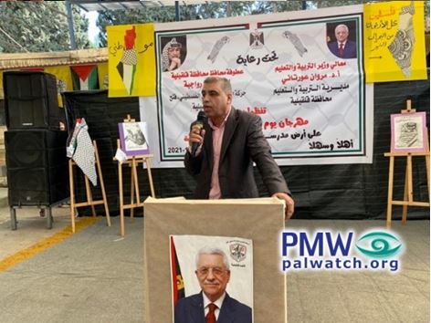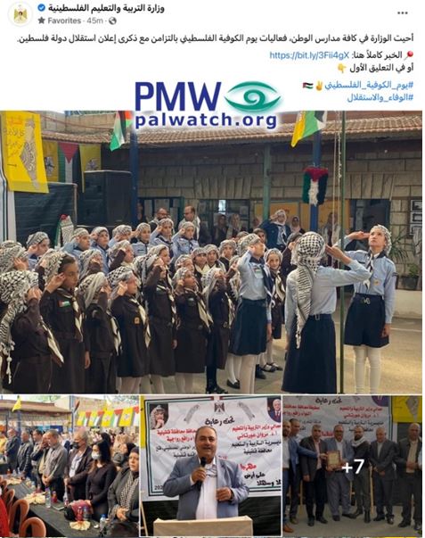 Posted text: “Today, [Nov. 16, 2021,] the [PA] Ministry [of Education] marked Palestinian Keffiyeh Day (i.e., Arab headdress) in all the homeland’s schools, which takes place simultaneously with the State of Palestine’s declaration of independence (see note below -Ed.).”