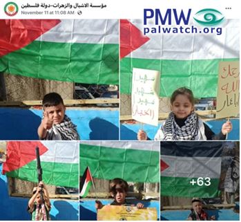 Kindergarteners pose with toy rifles, military uniform and maps erasing Israel, as well as holding signs stating "Palestine - Jerusalem is ours"