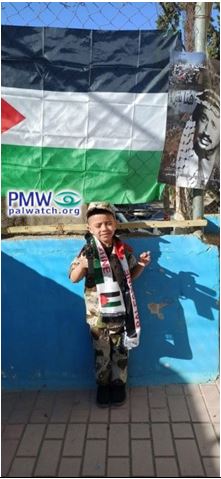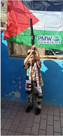 The following image shows a boy in military uniform and a scarf featuring the Palestinian flag and the word “Palestine” in English aiming a toy rifle at the camera in front of a Palestinian flag and a picture of Arafat.