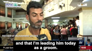 Father of Muhammad Da’das: “In the name of Merciful Allah, this is a source of pride for us. This raised our heads. A source of pride for us, for Palestine, and for the sake of supporting the prisoners… I’m very grateful. I’m so amazed and happy that my son died as a Martyr and that I’m leading him today as a groom. He is going to meet the prophets, the Martyrs, and the righteous. The angels will carry him and say: “We brought you a Martyr today.” It’s incredible how good the feeling and joy of the prophets and Martyrs is.”