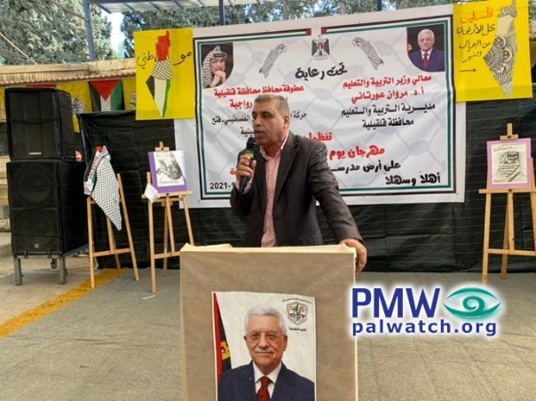 The image below shows a man speaking at the event. Behind him are three versions of the PA map of “Palestine” that presents all of Israel together with the PA areas as “Palestine.” The poster in the middle announces that the event is held “under the auspices of Qalqilya District Governor Rafe’ Rawajbeh and [PA] Minister of Education Marwan Awratani”:
