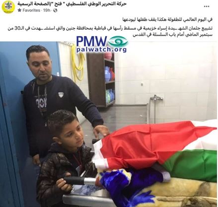 On international Children's Day, Fatah posts photo of young child standing over the dead body of his terrorist mother