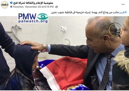 Jenin District Deputy Governor Kamal Abu Al-Rub is standing with the son of dead terrorist Israa Khzaimiah next to her body, which is covered in a Palestinian flag.