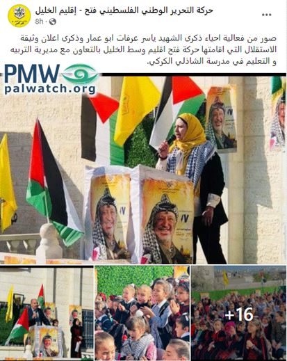 Posted text: “Pictures from the event to mark the anniversary of the death as a Martyr of [former PLO Chairman and PA President] Yasser Arafat and the day of the [Palestinian] declaration of independence, which was held by the Fatah Movement’s central Hebron branch in partnership with the [Hebron] education directorate (i.e., under the PA Ministry of Education) at the [Sheikh Ali] Al-Shadhili Al-Karaki School [in Hebron].”