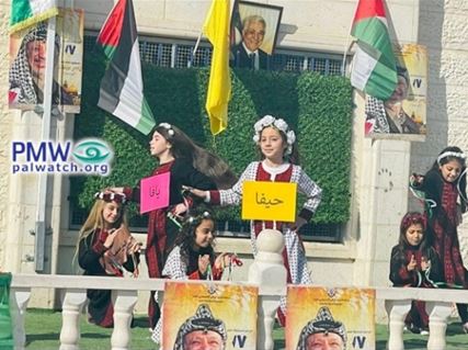 The image shows young girls giving a performance at the event, two of whom are wearing signs bearing the names of the Israeli cities “Haifa” and “Jaffa.” In the background are Palestinian flags and a yellow Fatah flag, a picture of PA Chairman Mahmoud Abbas, and posters showing former PLO and PA Chairman Yasser Arafat.