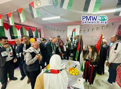 The image shows people standing in a room during the event, with Palestinian flags decorating the room. In the background is a poster featuring the PA map of “Palestine” that presents all of Israel together with the PA areas as “Palestine” in the colors of the Palestinian flag.