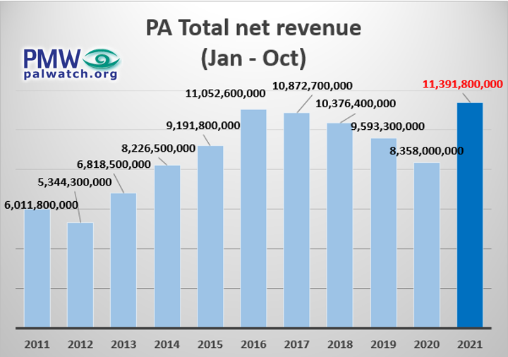 According to the PA’s financial report, the PA net income for the first 10 months of 2021 totaled 11,391,800,000 shekels. This reflected a rise of 1.798 billion shekels in comparison to 2019 and over 3 billion shekels in comparison with 2020. Over the last decade, the PA net income has gradually doubled.