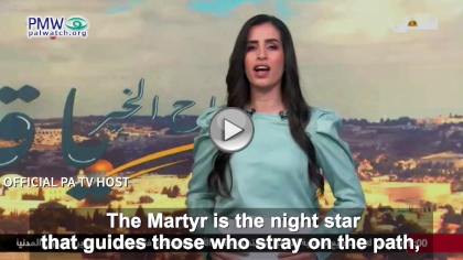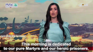 Official PA TV host: “The homeland bows in honor before the souls of its heroes… The Martyr is the night star that guides those who stray on the path, the words attempt to describe him, but it is impossible – this is the Martyr. I am from a homeland, half of which is Martyrs, half of which is refugees, and the rest are awaiting [Martyrdom]. Fragrance engulfs the city until it is suffocating – the Martyr sits on the shoulders of Heaven and smiles. My homeland taught me that it is the blood of the Martyrs that draws the borders of the homeland. We have lost and the Martyrs have gained… This morning is dedicated to our pure Martyrs and our heroic prisoners. We say to them: Good Morning Jerusalem!”