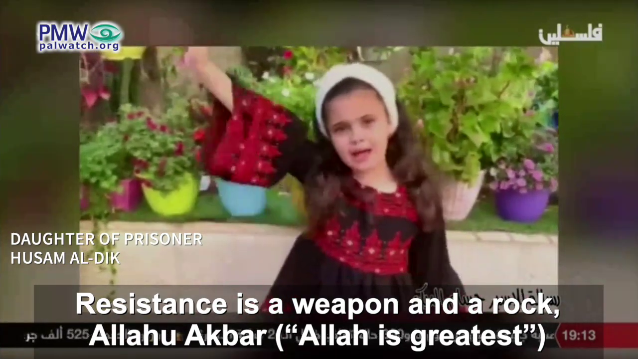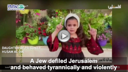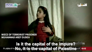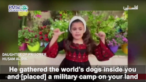 Recently the program aired two such home videos of two young girls performing songs for their imprisoned relatives. Both songs presented an antisemitic view of Jews, demonizing them as “impure” and “the world’s dogs”. One song also glorified violence and terror: