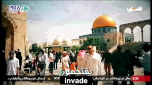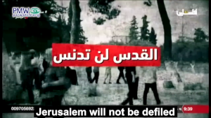 For example, in this broadcast on official PA TV, the PA shows Jews at the Temple Mount while text on the screen warns viewers: "Jerusalem will not be defiled."