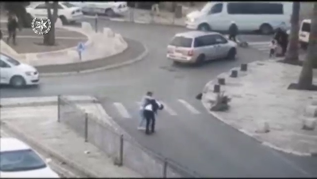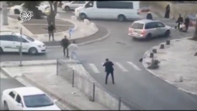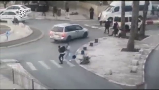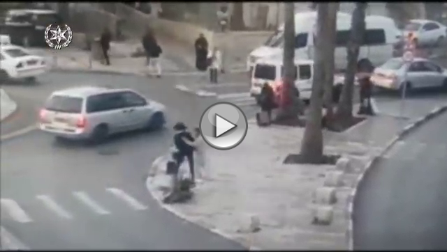 On Saturday, a Palestinian terrorist attacked an Israeli man walking towards Jerusalem’s Old City to participate in the afternoon prayers. After stabbing and wounding the Israeli [slides 1-3], the terrorist then lunged toward Israeli police officers [slide 4] at the scene who responded to the attack by shooting and killing the terrorist. The attack was captured on Israeli police video: