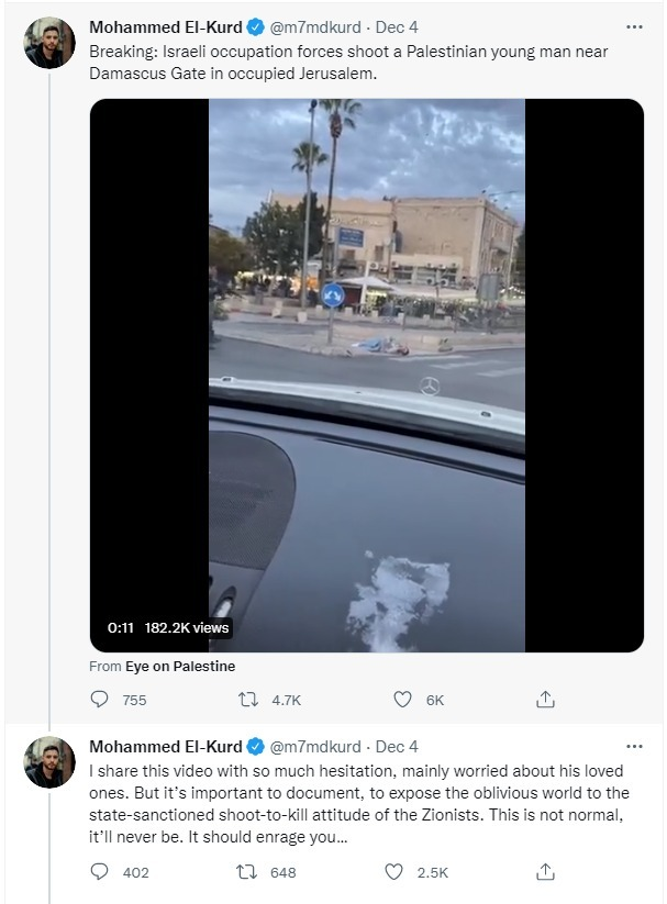 As part of the nefarious propaganda, El-Kurd added the half-truth: “Israeli occupation forces shoot a Palestinian young man near Damascus Gate in occupied Jerusalem,” leaving out of his tweet that the “young man” just seconds earlier had stabbed a civilian.