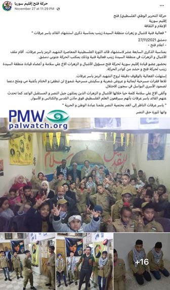 Damascus – Nov. 27, 2021 – Fatah [Commission of] Information [and Culture] – For the 17th anniversary of the death as a Martyr of commander of the modern Palestinian revolution, Martyr and symbol Yasser Arafat, the Lion Cubs and Flowers organization in the Sayyida Zainab area [held] artistic activities in Fatah’s office in southern Damascus.”