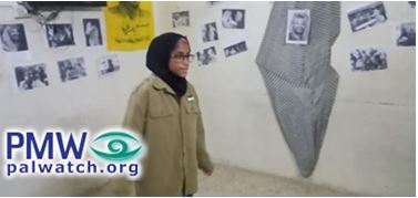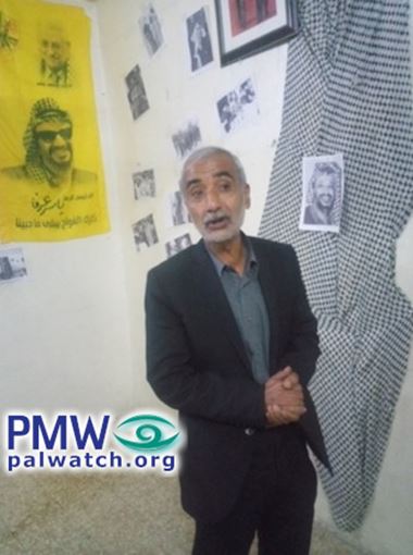 Images are shown from the event at the Fatah office in Damascus. On the walls are pictures of Khalil Al-Wazir “Abu Jihad,” a terrorist responsible for the murder of 125; Dalal Mughrabi, a terrorist who led the murder of 37, 12 of them children; former PLO and PA Chairman Yasser Arafat; and the PA map of “Palestine” that presents all of Israel together with the PA areas as “Palestine” made out of keffiyehs (Arab headdresses).