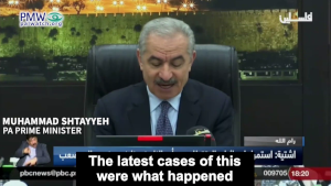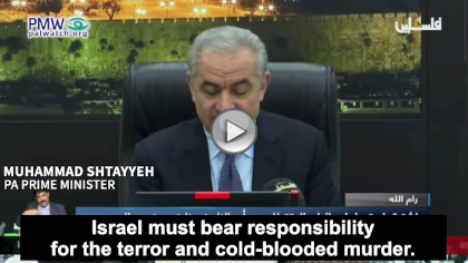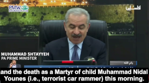 PA Prime Minister Muhammad Shtayyeh: “Israel must bear responsibility for the terror and cold-blooded murder. The latest cases of this were what happened with Muhammad Shawkat Abu Salima (i.e., terrorist stabber), and the death as a Martyr of child Muhammad Nidal Younes (i.e., terrorist car rammer) this morning.”