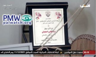 The screenshot shows an honorary plaque from Fatah in the family’s home. At the top of the plaque is the Fatah logo that includes a grenade, crossed rifles, and the PA map of “Palestine” that presents all of Israel together with the PA areas as “Palestine.”