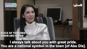 Niece of terrorist Samir Abu Nimeh: “You are a hero [Uncle Samir]. I always brag about you to my friends and acquaintances. I always talk about you with great pride. You are a national symbol in the town [of Abu Dis]. Your name is known and there is no need to explain who you are, but I always take pride in mentioning you.”