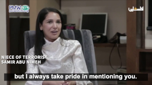 Imprisoned terrorist Samir Abu Nimeh was involved in a bus bombing in 1983 in which 6 were murdered, including two sisters aged 13 and 15, and 44 were wounded, and an attack with grenades at a ceremony at the Western Wall in 1986, in which one was murdered and 69 wounded. For his adult niece, these crimes are a source of immense pride, so much so that she “always brags about him to her friends and acquaintances.” Addressing him directly on official PA TV, which Palestinian terrorists watch in Israeli prisons, Abu Nimeh’s niece called her murderous uncle a “hero” and “national symbol”: