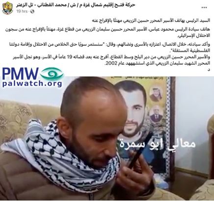 The video shows Islamic Jihad terrorist and released prisoner Hussein Suleiman Al-Zre’i speaking on the phone with PA Chairman Mahmoud Abbas, who called to congratulate him on his release.