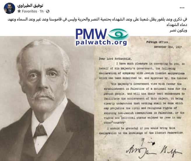 Posted text: “On the anniversary of the Balfour Promise (i.e., Declaration), our people adheres to the Martyrs’ promise on the necessity of victory and freedom. In our dictionary we have no promise other than the promise of Heaven, the promise of the Martyrs’ blood – and there will be victory.”