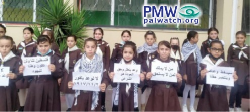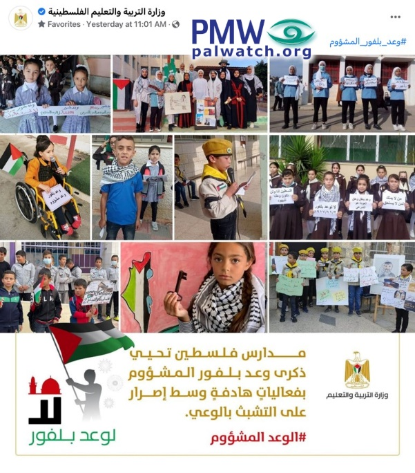 At PA schools children are taught that “the wretched Balfour Promise” was given by “one who has no ownership to one who has no right” and that it was “the cause for the loss of Palestine.” The PA Ministry of Education and the Fatah Movement posted numerous images from events at PA schools marking the anniversary of the Balfour Declaration. The following are some of them: