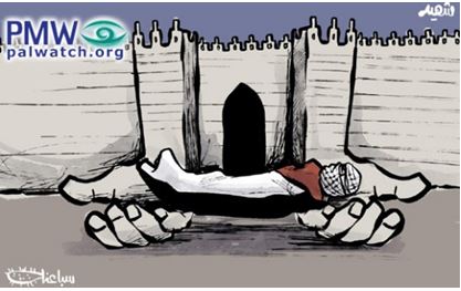 The cartoon shows a gate of the Old City of Jerusalem with hands coming out of it holding a dead body wrapped in a Palestinian flag with a keffiyeh (Arab headdress) on its head.