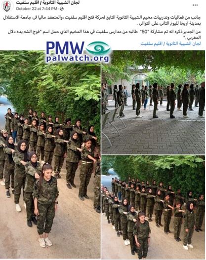 Posted text: “Some of the activities and drills of the Fatah Shabiba High School [Movement Committees] – Salfit Branch camp, which is currently being held at Al-Istiqlal University (i.e., PA Security Forces university) in Jericho for this the second consecutive day. It should be noted that 50 female students from the schools in Salfit are participating in this camp that bears the name ‘Class of Mart.yr (the “.” is an apparent attempt to evade Facebook’s algorithm -Ed.) Dalal Mughrabi’ (i.e., terrorist who led murder of 37 people, 12 of them children).