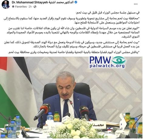 Video posted on the Facebook page of PA Prime Minister Muhammad Shtayyeh, the video shows Shtayyeh speaking at a PA governmental meeting held in Bethlehem