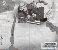 Cartoon map: Euphrates to the NileAl-Hayat Al-Jadida, official PA daily |Aug 5, 2003Former Israeli PM, Ariel Sharon, on a map of Mid-East looking at the Nile. Caption: "From the Euphrates to the Nile."