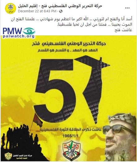 The image shows the silhouettes of a group of men standing with a Palestinian flag in the bottom left, former PLO and PA Chairman Yasser Arafat in the bottom right, and the Fatah logo that includes a grenade, crossed rifles, and the PA map of “Palestine” that presents all of Israel together with the PA areas as “Palestine” in the bottom center.