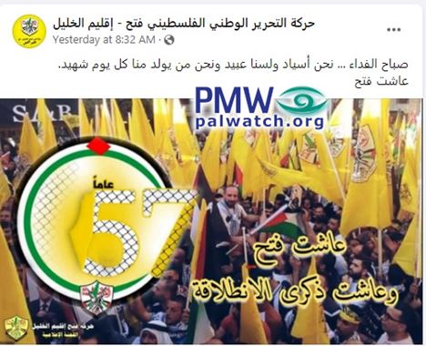 Text on image: “Long live Fatah and long live the anniversary of the Intilaqa (i.e., the anniversary of “the Launch” of Fatah, counted from its first terror attack against Israel)