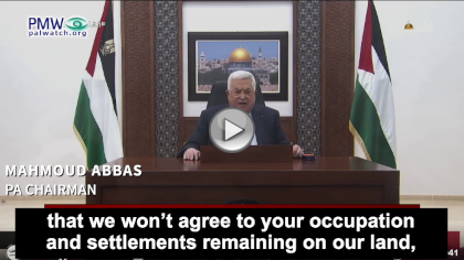In a speech at an event celebrating Fatah’s anniversary, PA and Fatah Chairman Mahmoud Abbas not only praised imprisoned, wounded, and dead terrorists as “brave” and “heroic,” but also implied that PA/Fatah won’t hesitate using violence and terror to get rid of Israel, i.e., “occupation and settlements remaining on our land.” To its own people, the PA and Fatah define all of Israel as an “occupation” and all Israeli cities as “settlements.” Only in international forums and when meeting Israelis does the PA accept Israel's existence: