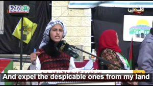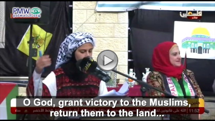 That the PA/Fatah focus is “liberation of Palestine” from “the Jews” was made clear by a female student at a PA school in Jenin who recited the following text during celebrations of the anniversary of Fatah. The text urges God to take the “thieving” Jews “to hell,” “grant victory to the Muslims” and “expel the despicable ones from my land and liberate it from the Jews”: