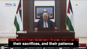 PA Chairman Mahmoud Abbas: “We also send our brave prisoners a salute of honor and appreciation for their giving, their sacrifices, and their patience for the confrontation with the occupation and its prison guards, in order to defend their freedom, the freedom of the homeland, and the honor of our people and its rights. We also salute our heroic wounded and tell our heroes the prisoners and the wounded and their families and the families of the Martyrs that we won’t abandon you. Your struggles are lofty medals of honor that testify to your sacrifices for the sake of defending your homeland and your people. May you all be blessed.”