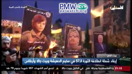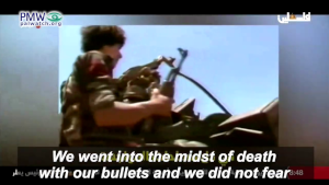 During broadcasts focusing on the anniversary, official PA TV aired music videos and songs with footage of Palestinian military training and lyrics praising terror “operations” and lauding weapons: