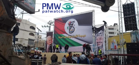 What is also entirely clear from Fatah’s anniversary celebrations is that Fatah’s vision for the future remains a world with no Israel. The poster below made for the anniversary features the PA map of “Palestine” that erases all of the State of Israel in the colors of the Palestinian flag, as well as a rifle. The visual message underscores Fatah’s message: That Fatah’s goal is to erase all of Israel by means of violence and terror in order to establish “Palestine” on the entire area: