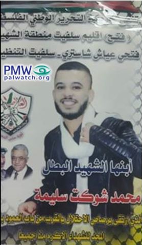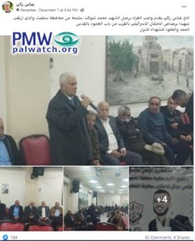 Posted text: “[Fatah Central Committee member] brother Abbas Zaki upholds the commandment of comforting the mourners over the death of Martyr Muhammad Shawkat Salima (i.e., terrorist, wounded 1 person) from the Salfit district, who was shot by the Israeli occupation and ascended to Heaven as a Martyr adjacent to the Damascus Gate in Jerusalem. Glory and eternity for the pure-hearted Martyrs.”
