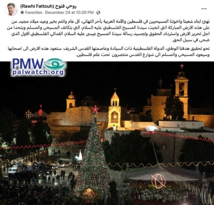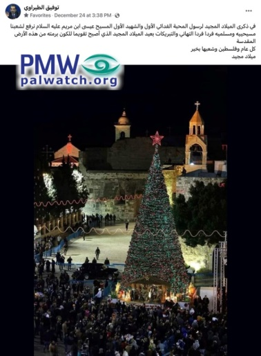 Posted text: “The best of blessings and wishes for the Christian families, friends, and communities for the blessed Christmas of the prophet of peace, Jesus son of Mary, and a special blessing for our people that is celebrating this blessed event in a special way and in a different sense, because the messiah, peace be upon him, has an additional and extraordinary status in our Palestinian hearts, for he is the first self-sacrificing fighter who raised his divine message without any fear, and he is the first Mar,,tyr (see note below -Ed.) who sacrificed his life for his belief in justice – he is the first self-sacrificing fighter, and he is the first Martyr.