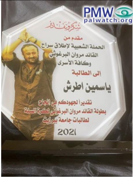 The above image shows an honorary plaque featuring an image of Barghouti.