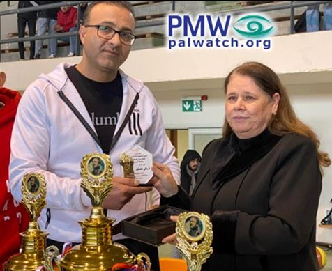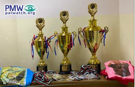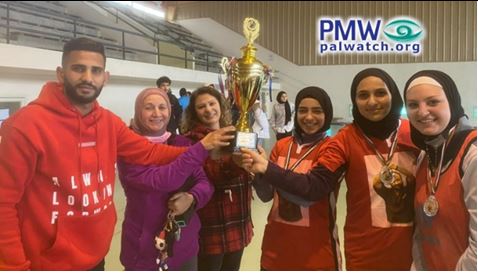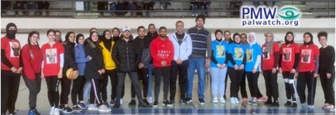 The below image shows a pink shirt of female students participating in a basketball championship at Birzeit University named after terrorist Marwan Barghouti, who orchestrated three attacks in which 5 people were murdered. The shirt shows an image of Barghouti. On top of the shirt is a medal with an image of Barghouti on it.