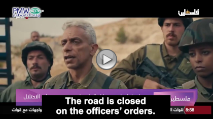Recently official PA TV broadcast a scene from the film “Checkpoint” by Palestinian director Omar Rammal, which PA TV described as being about “the suffering of the Palestinians due to the occupation’s checkpoints.” The excerpt shown demonizes Israeli soldiers as heartless killers who murder for no reason. A Palestinian family wants to go through an Israeli checkpoint to “take the kids to the amusement park,” but the Israeli commander tells them the road is closed. While they talk, another soldier is seen aiming his rifle at two children with their backs turned. Gun shots are heard, and the next scene shows one child shot and lying on the ground – murdered in cold blood.