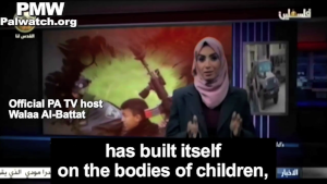 Unfortunately the PA has continued to disseminate these libels and others, telling Palestinians that Israelis want to harm them, destroy them, and kill them. Especially children are warned that Israel is out to get them. Palestinian Media Watch has exposed that the popular host of children’s programs on official PA TV, Walaa Al-Batat, told viewers that Israel "murders, imprisons, and tortures" Palestinian children, and "has built itself on the bodies of children."