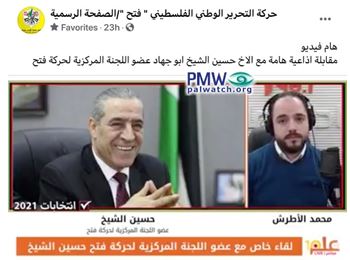 Video posted on the official Fatah Facebook page; the video is an interview with Fatah Central Committee member and Head of Civil Affairs in the PA Hussein Al-Sheikh on the Hebron radio station Al-Alam