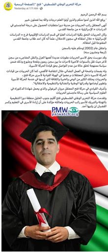 Prisoner Rateb Al-Hreibat (PMW was unable to determine the details of his crimes –Ed.) from Dura has completed the requirements to receive a master’s degree in ‘Israeli Studies’ from Al-Quds University.