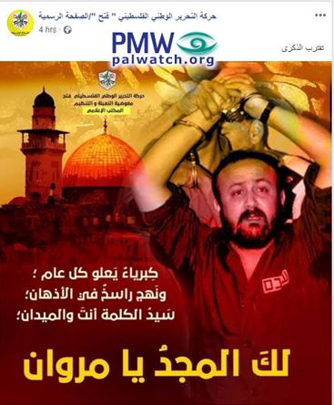 The image shows terrorist Marwan Barghouti, who orchestrated three attacks in which 5 people were murdered, wearing a prison uniform and raising his cuffed hands. To the left is the Dome of the Rock and the Al-Aqsa Mosque, and in the background is a keffiyeh (Arab headdress) pattern. In the top left is the Fatah logo that includes a grenade, crossed rifles, and the PA map of “Palestine” that presents all of Israel as “Palestine” together with the PA areas.