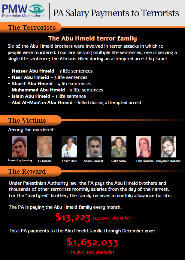 Ultimately, as a reward for having 6 terrorist murderers in the family, every month the PA pays the Abu Hmeids $13,223 (42,400 shekels) as part of its “Pay-for-Slay” terror reward policy.