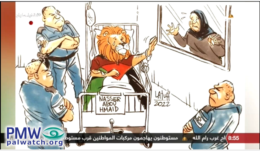 Following the visit, PA TV broadcast a cartoon depicting Abu Hemid as a lion, lying in a hospital bed, covered in a Palestinian flag, with his mother looking at him: