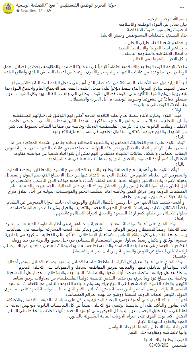 It is important to continue the mass-participant popular activities as part of the constant popular resistance (i.e., term used by Palestinians, which also refers to the use of violence and terror) to the occupation, as a sign of rejecting the settlement enterprise and the imposing of facts on the ground. We note the significance of extensive participation in the activities this coming Friday [Aug. 6, 2021] at all the friction points.”