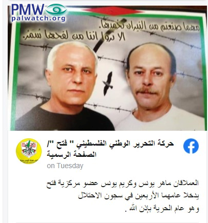 Posted text: “The two giants Maher Younes and Fatah Central Committee member Karim Younes (i.e., terrorist cousins, murdered 1) are beginning their 40th year in the occupation’s prisons, and this is the year of freedom, Allah willing”